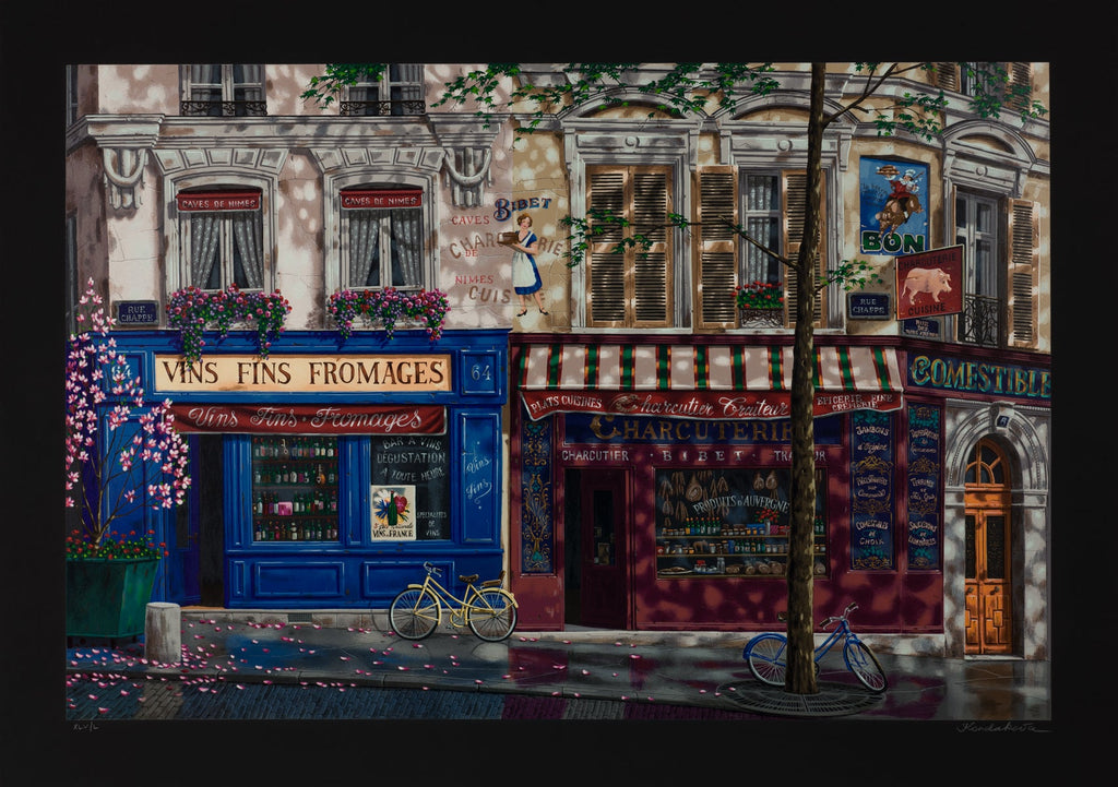 "Les Marches Parisiens" is a serigraph on black paper created by Liudmila Kondakova in 2002. From the edition of 50 on black paper, the edition also included 125 on white paper and 325 on canvas for a total edition size of 500. The artwork is signed 'Kondakova' lower right and annotated lower left. The image size is 24 x 36" and the artwork is framed in a classic, gold-tone frame. The artwork ships framed and accompanied by a certificate of authenticity.
