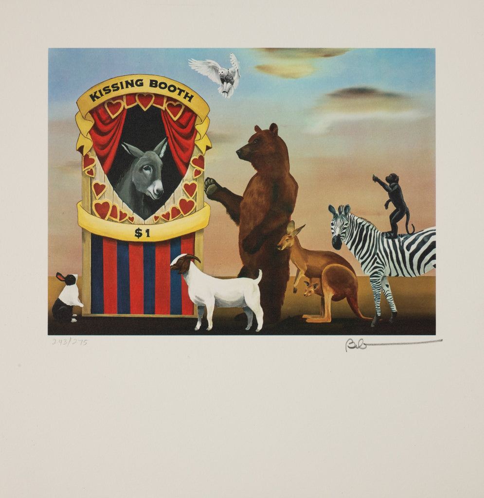 "Kissing Ass" is a lithograph on paper created by Robert Deyber in 2019. From the edition of 395,the artwork is initialed 'BD' lower right and annotated lower left. The image size is 6.75 x 9" and the artwork is framed in a contemporary, silver-tone frame. The artwork ships framed and accompanied by a certificate of authenticity.