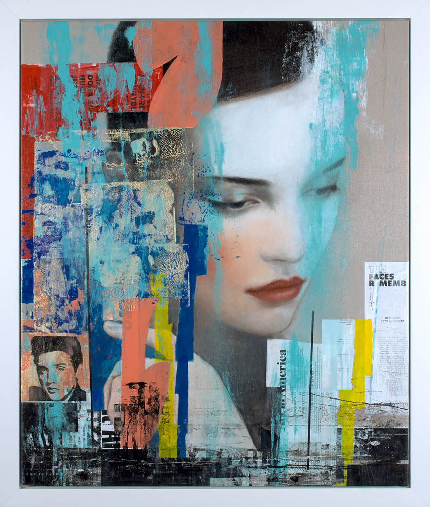 "First Look" is an oil and mixed media on canvas painting created by François Fressinier in 2019. The artwork is signed 'FRESSINIER' lower left. The canvas size is 36 x 30" and the artwork ships framed in a contemporary white frame. The artwork ships framed.
