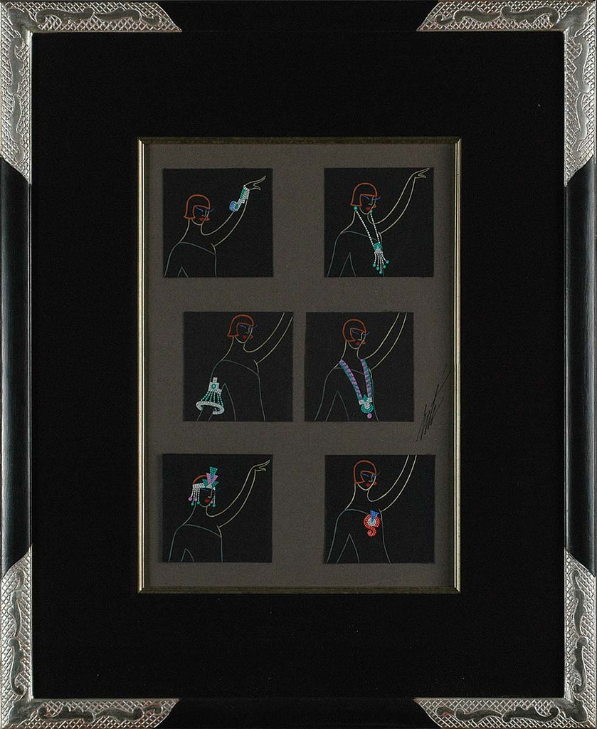 "Musidora & Bijoux Lumineux (La Chauve-souris, Parisiana 25) II" is a set of 6 gouaches on paper adhered to paper created by Erté in 1979. The artwork is signed 'Erté' center right and numbered and titled in Erté's hand verso - "No 18.624", "Musidora", "Bijoux Lumineux", "Parisiana", "Ballet de Roland Petit." The Erté and "Composition originale" stamps are also included verso. The image size is 12.75 x 8.75" and the artwork is framed in a custom, closed-corner, Art Deco frame. The artwork ships framed.
