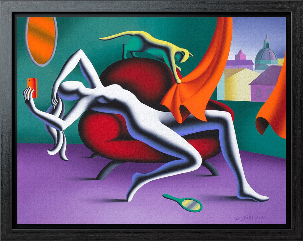 "Art of Desiree” is an oil on canvas painting created by Mark Kostabi in 2020. The artwork is signed and dated 'KOSTABI 2020' lower right. The canvas size is 39.5 x 51.25" and the artwork is framed in a contemporary black frame. The artwork ships framed.