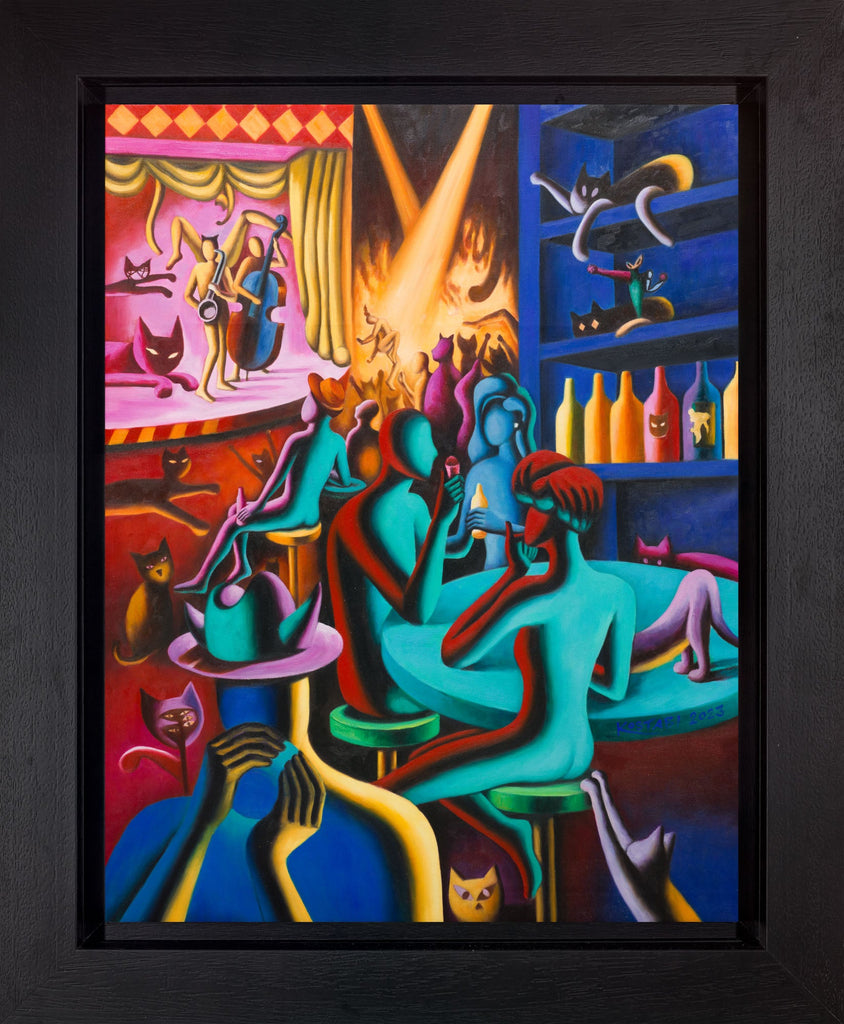 "Catmania" is an oil on canvas created by Mark Kostabi in 2023. The image size is 51.18" x 39.37". The artwork ships framed, signed and with a certificate of authenticity.
