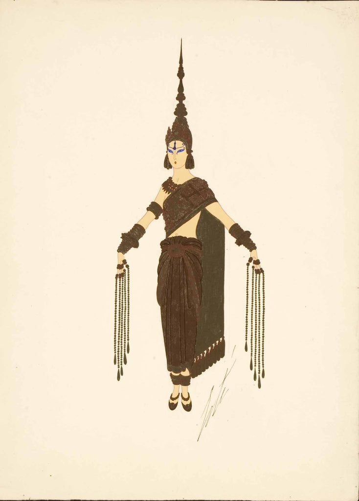 "Les Trésors de l'Indo-Chine" is a gouache on paper painting created by Erté in 1922. The artwork is signed 'Erté' lower right. The image size is 11 x 5" and the artwork is framed in an ornate, gold-tone frame. The artwork ships framed.