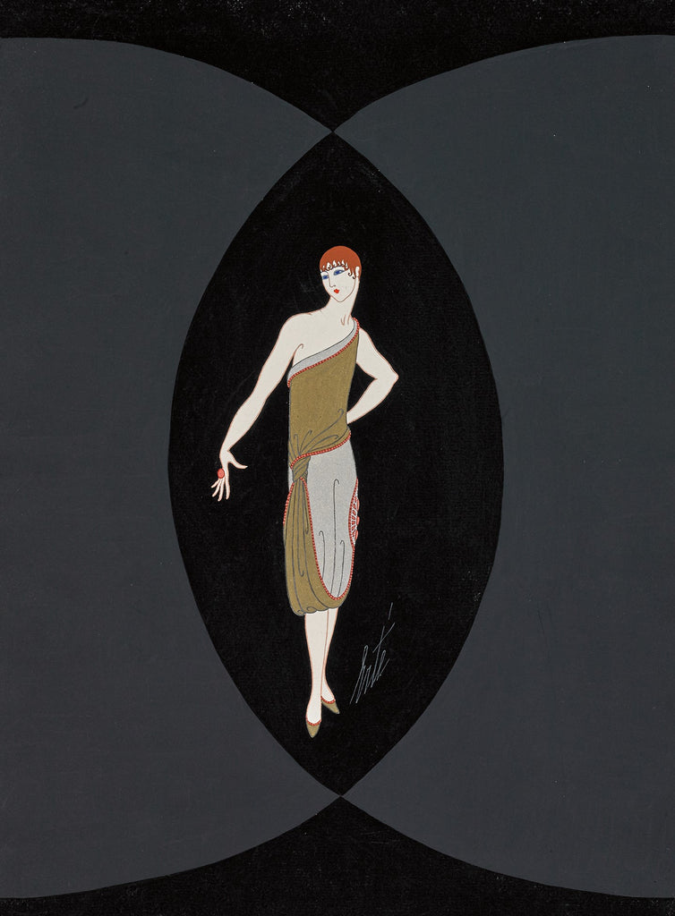 "Robe du Soir (Manhattan Mary)" is an original gouache on paper created by Erté in 1927. The artwork is signed 'Erté' center right of figure, and is stamped with Erté's Villa Excelsior block stamp and 'Composition originale' verso. The image size is 15.25 x 11.25" and the artwork is framed in a custom, closed-corner, Art Deco frame. The artwork ships framed.