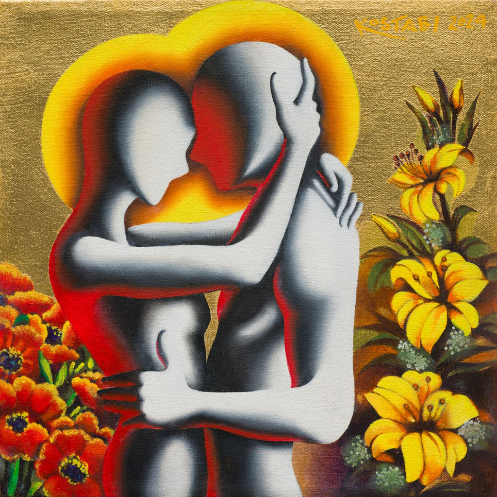 "The Eternal Spring" is an oil on canvas painting created by Mark Kostabi in 2024. The artwork is signed 'KOSTABI 2024' upper right. The canvas size is 11.62 x 11.87" and the artwork is framed in a contemporary black frame. The artwork ships framed.