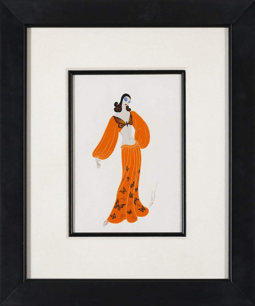 "Untitled (Butterfly Lady)" is a gouache painting on paper created by Erté in 1977. The artwork is signed 'Erté' lower right. The image size is 10.5 x 7.5" and the artwork is framed in a contemporary, black frame. The artwork ships framed.