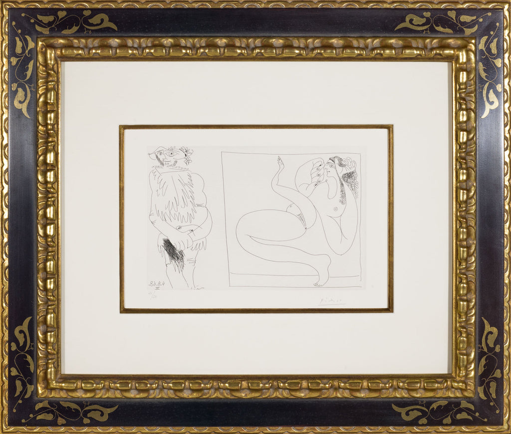 In printmaking, the 347 Series was the undertaking which defined late Picasso. This prodigious outpouring of work, dating from March 16th–October 5th, 1968, deals with all of his old themes and fantasies, adding an obsession newly central in the late sixties, the artist as voyeur. It is in this role, rather than that of a protagonist, that the artist figures in these fantastic narration's. The series has been described as taking the form of a stream-of-consciousness epic. There is a suggestion of narratives throughout the series; however, there is never a point where a story comes to completion or where suggested desire is realized. There are faces we know, tales we have seen, and the work of great masters is recognizably revisited, but all without a clear endpoint. These prints become instead a stroll through the mind and memories at the end of Picasso’s much-lived life. A note about the technical production of these plates - to work with full freedom and concentration, Picasso had his printers, the brothers Crommelynck, bring the etching plates and hand press to his farmhouse near Cannes.