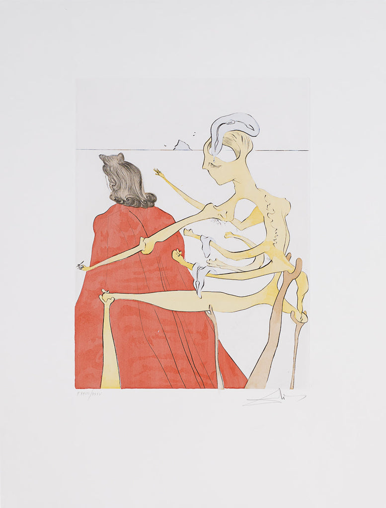 "The Divine Back of Gala (Plate B)" is an etching with pochoir created by Salvador Dalí in 1974 for his series 'After 50 Years of Surrealism'. From the edition of 462, the artwork is signed 'Dalí' lower right and annotated lower left. The image size is 15.75 x 12" and the artwork is framed in a custom, ornate, gold-tone frame. The artwork ships framed and accompanied by a certificate of authenticity.