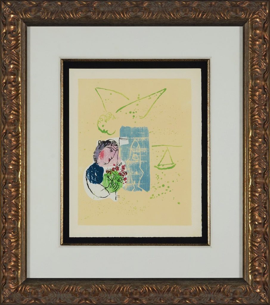 "Le Jardin (#3)" from Marc Chagall's 'Poèmes', 1968. This artwork is a color woodcut on Rives wove paper from the edition of 238. The image size is 13 x 10". The artwork ships framed and accompanied by a certificate of authenticity.