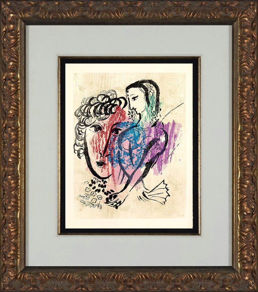 "Pour ce Jour (#7)" from Marc Chagall's 'Poèmes', 1968. This artwork is a color woodcut on Rives wove paper from the edition of 238. The image size is 13 x 10" and the artwork is framed in an ornate, gold-tone frame. The artwork ships framed and accompanied by a certificate of authenticity.