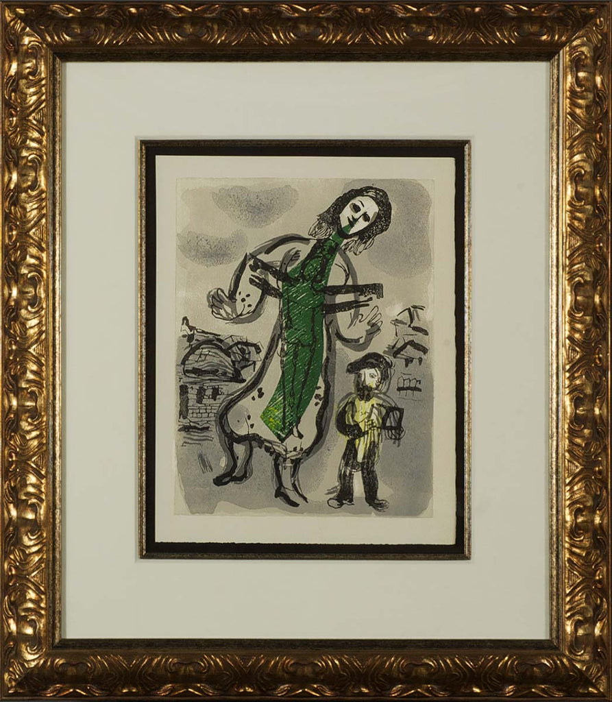"Où est le Jour (#13)" from Marc Chagall's 'Poèmes', 1968. This artwork is a color woodcut on Rives wove paper from the edition of 238. The image size is 13 x 10" and the artwork is framed in an ornate, gold-tone frame. The artwork ships framed and accompanied by a certificate of authenticity.