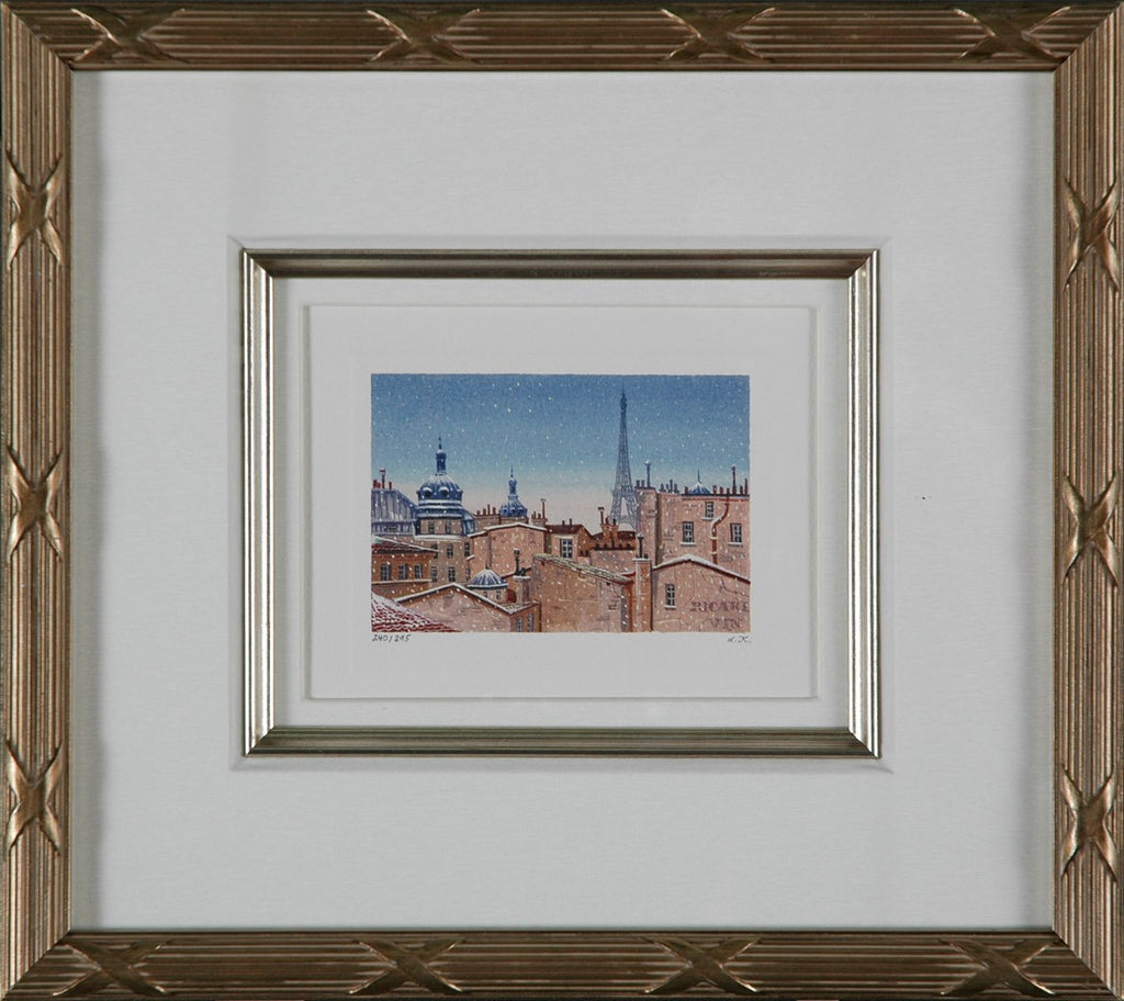 "Snowfall in Paris" is a lithograph on paper created by Liudmila Kondakova in 2006. From the edition of 325, the artwork is initialed 'L.K' lower right and annotated lower left. The image size is 3 x 4.25" and the artwork is framed in a classic 'reed and ribbon' gold-tone frame. The artwork ships framed and accompanied by a certificate of authenticity.