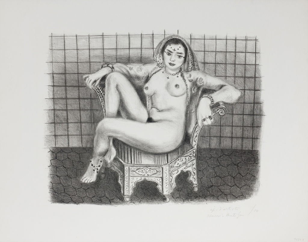 "Jeune Hindoue" is a lithograph created by Henri Matisse in 1929. From the edition of 71, the artwork is signed signed 'Henri Matisse' and annotated lower right. The image size is 11.25 x 14.21" and the artwork is framed in a custom, closed corner, gold leaf frame. The artwork ships framed and is accompanied by a certificate of authenticity.