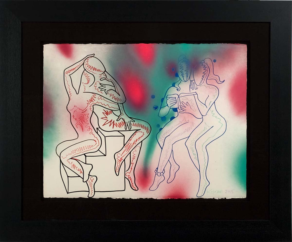 "Be Anything but Daring, Be Mine" is a mixed media on paper drawing created by Mark Kostabi in 2015. The artwork is signed and dated 'KOSTABI 2015' lower right. The image size is 23 x 30" and the artwork is framed in a contemporary black frame. The artwork ships framed.