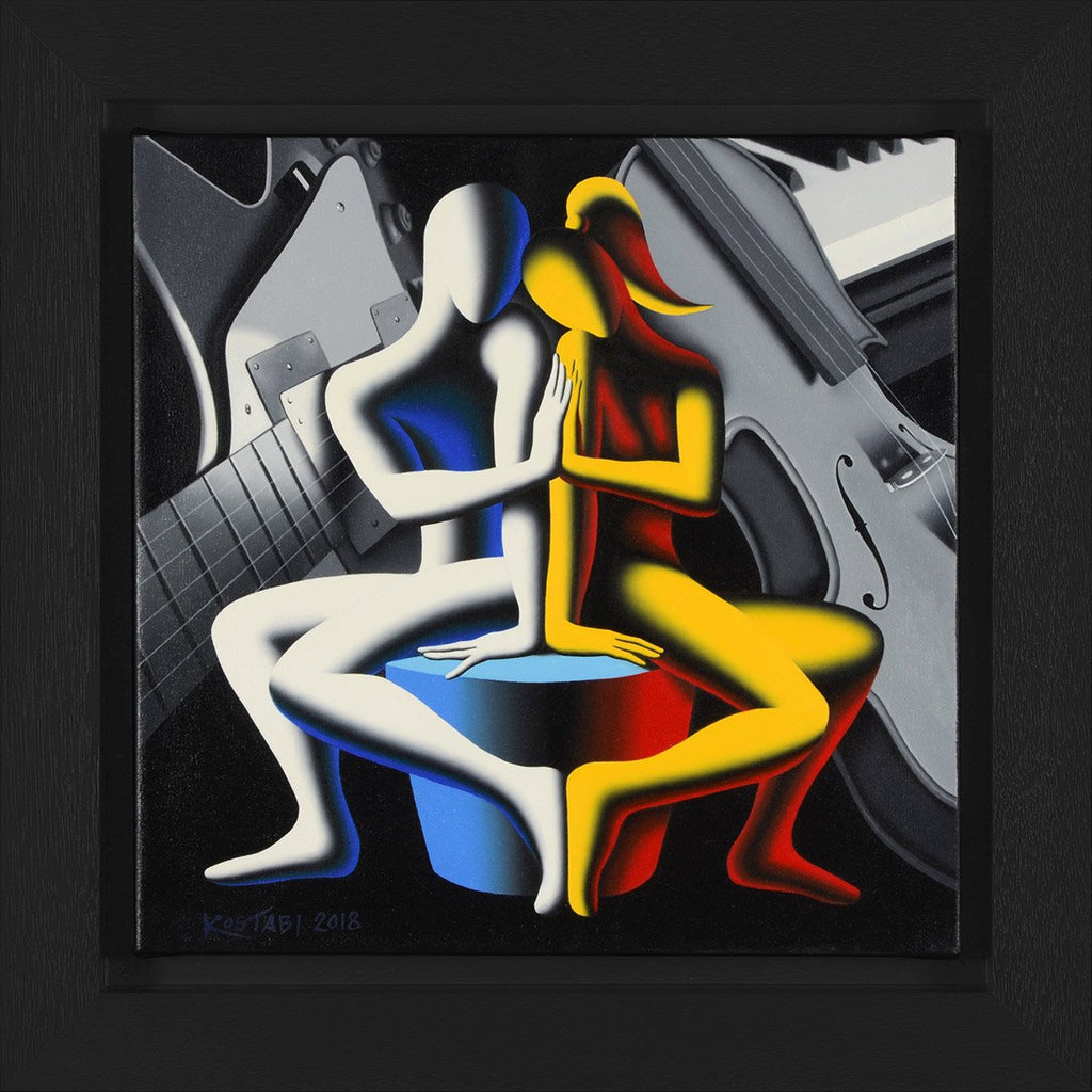 "Composers Concordance” is an oil on canvas painting created by Mark Kostabi in 2018. The artwork is signed and dated 'KOSTABI 2018' lower left. The canvas size is 19.75 x 19.75" and the artwork is framed in a contemporary black frame. The artwork ships framed.