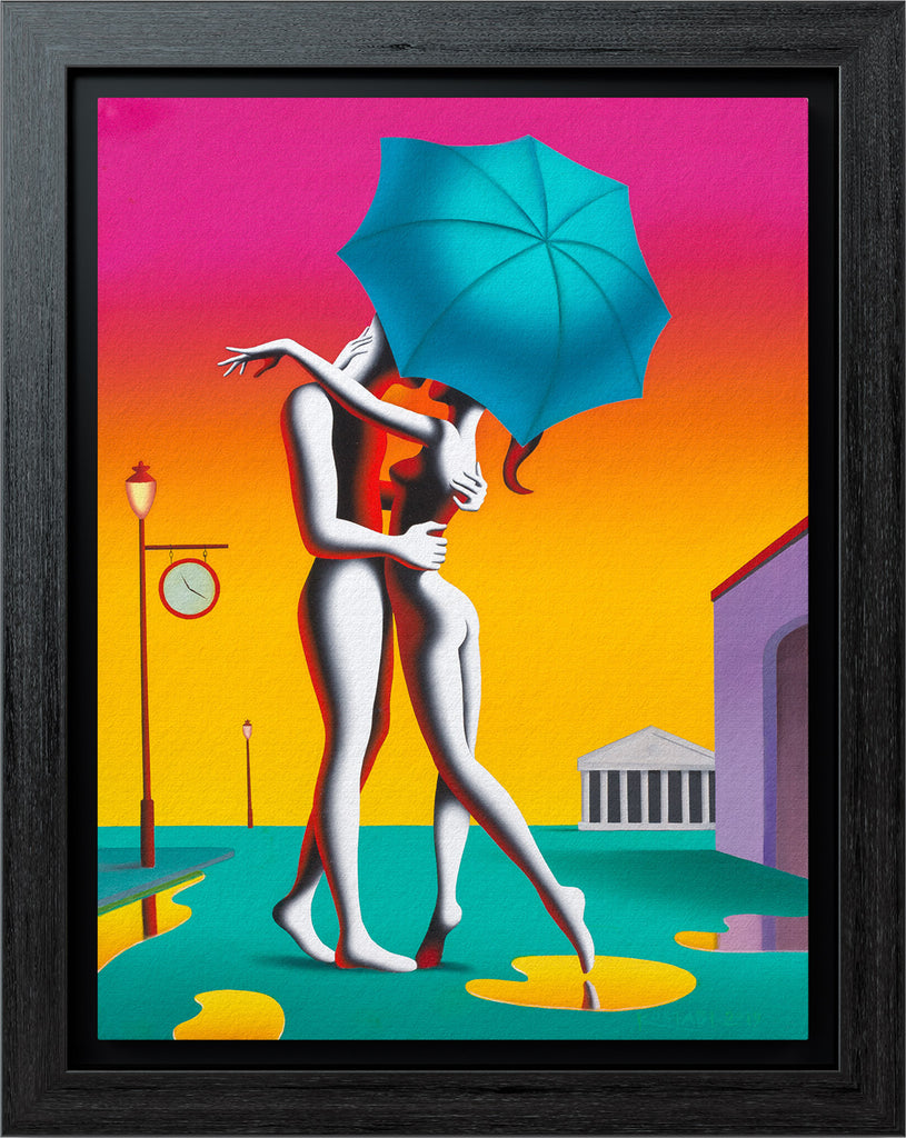 "Eternal Sunshine” is an oil on canvas painting created by Mark Kostabi in 2019. The artwork is signed and dated 'KOSTABI 2019' lower right. The canvas size is 31.5 x 23.75" and the artwork is framed in a contemporary black frame. The artwork ships framed.
