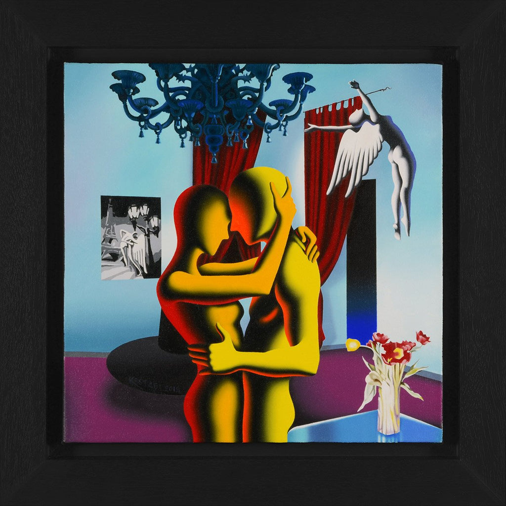 "Interior Passion" is an oil on canvas painting created by Mark Kostabi in 2018. The artwork is signed and dated 'KOSTABI 2018' lower left. The canvas size is 20 x 19.75" and the artwork is framed in a contemporary black frame. The artwork ships framed.
