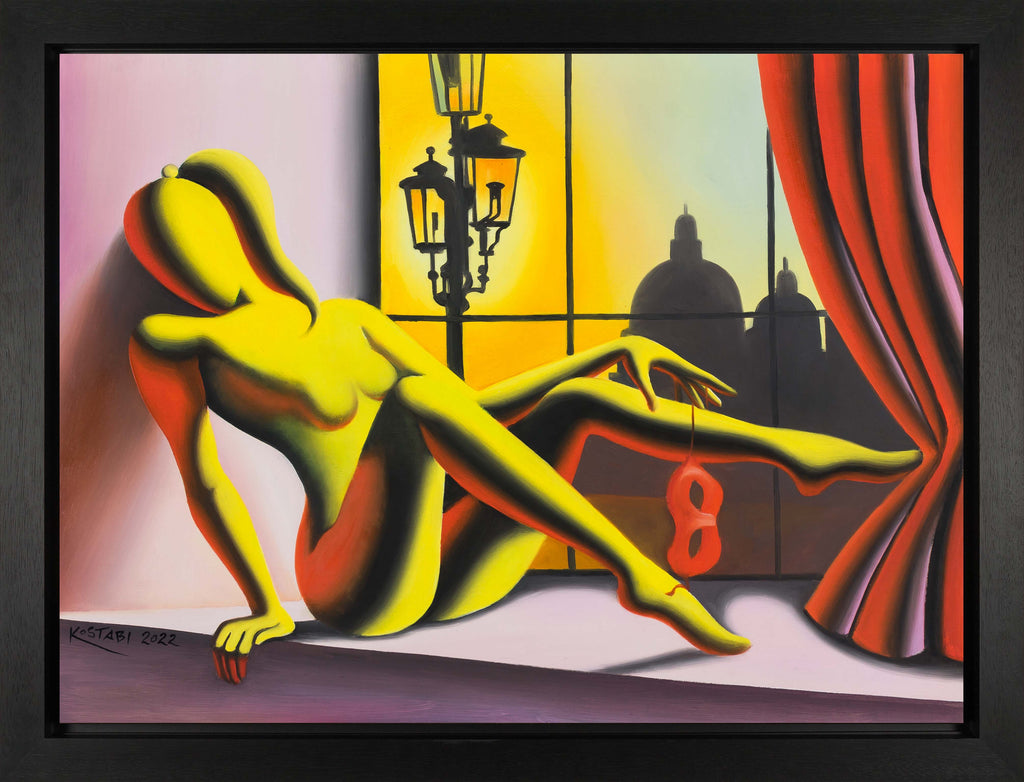 "She Had a Ball” is an oil on canvas painting created by Mark Kostabi in 2022. The artwork is signed and dated 'KOSTABI 2022' lower left. The canvas size is 18.5 x 24.75" and the artwork is framed in a contemporary black frame. The artwork ships framed.