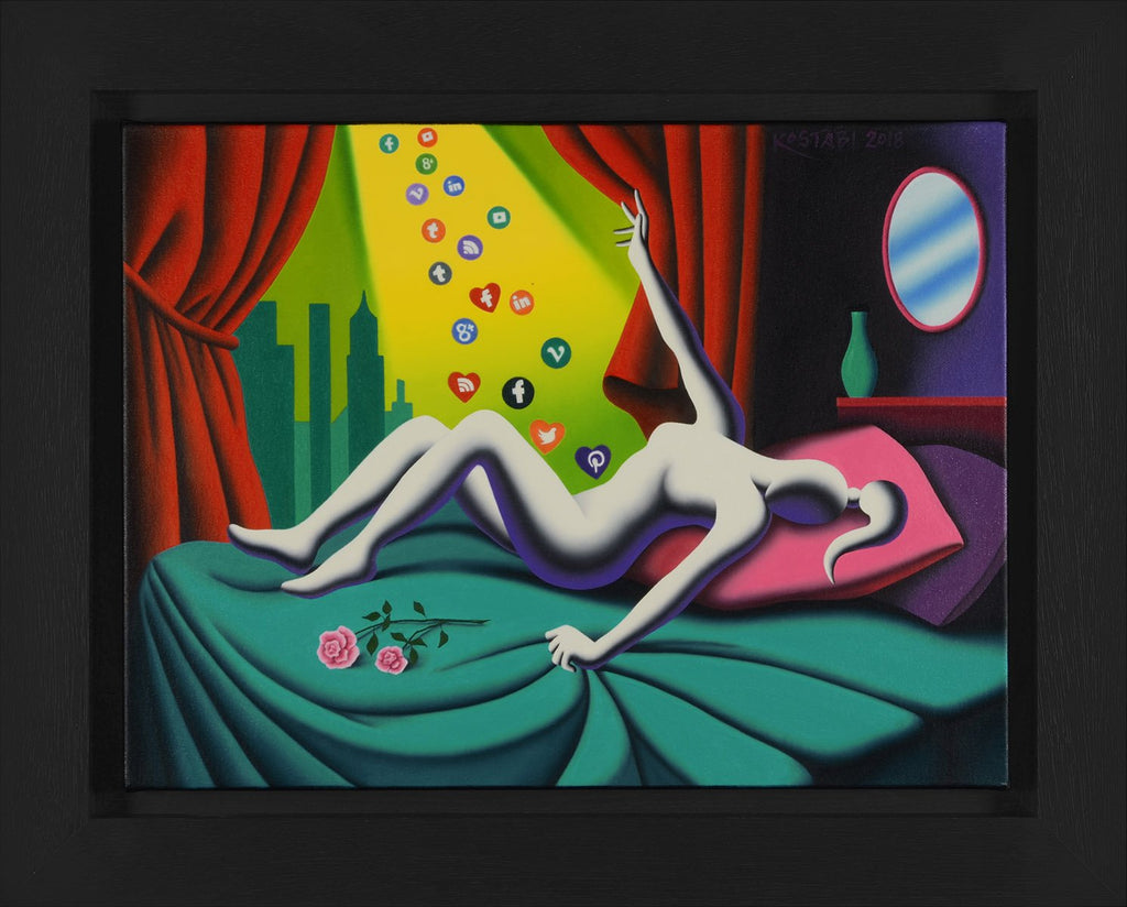 "The New Gods" is an oil on canvas created by Mark Kostabi in 2019. The image size is 17.75 x 23.75-inch. The frame size is 24.25 x 30.5-inch. "The New Gods" comes signed and with a certificate of authenticity.