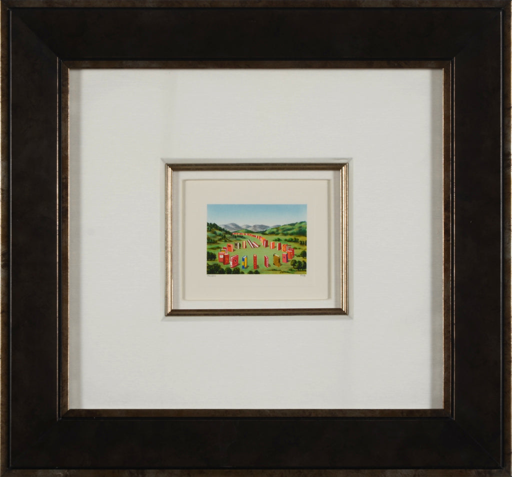 "Book Circle" is a lithograph created by Fanny Brennan in 1995. From the edition of 300, the artwork is initialed 'FMB' lower right and annotated lower left. The image size is 2 x 3" and the artwork is framed in a contemporary silver and dark gray frame. The artwork ships framed and accompanied by a certificate of authenticity.