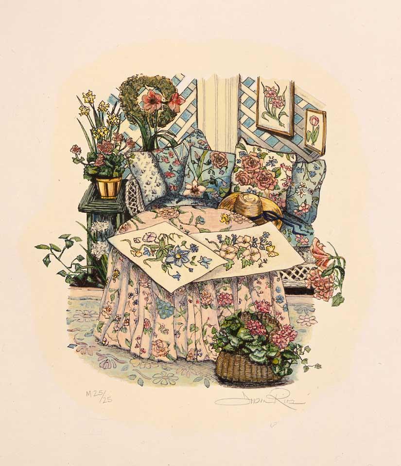 "In the Cottage (Places Suite)" is a serigraph created by Susan Rios. The image size is 11.75 x 11.5 -inch. The artwork ships framed, signed and with a certificate of authenticity.