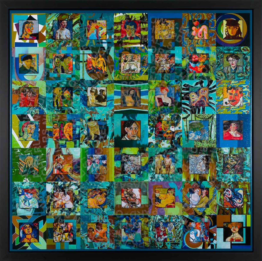 "Mere Daubers 6" is a digital pigment print with diamond dust on canvas created by Brad Faine in 2018 for his series 'Mere Daubers'. The artwork is signed, titled and dated on verso. The image size is 42.5 x 42" and the artwork is framed in a contemporary black frame. The artwork ships framed.