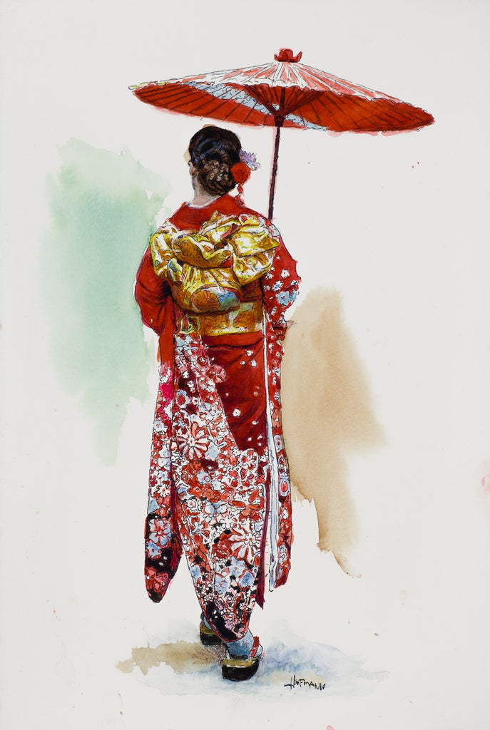 "Study for Silk and Bamboo" is a watercolor with pen and ink on paper painting created by Douglas Hofmann in 2024. The artwork is signed 'HOFMANN' lower right. The image size is 15 x 10" and the artwork is framed in a contemporary white frame. The artwork ships framed.