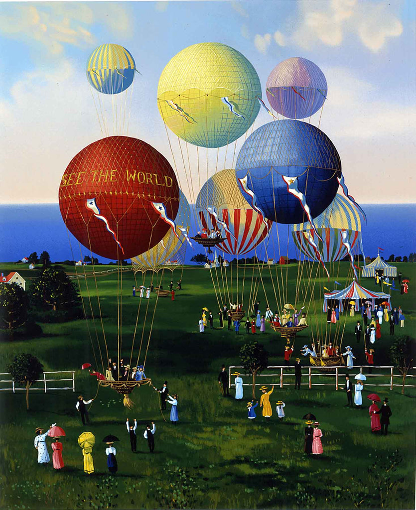 "Balloons, Balloons!" is a deluxe serigraph on linen created by Sally Caldwell Fisher. The image size is 33 x 27 -inch. The artwork ships framed, signed and with a certificate of authenticity.