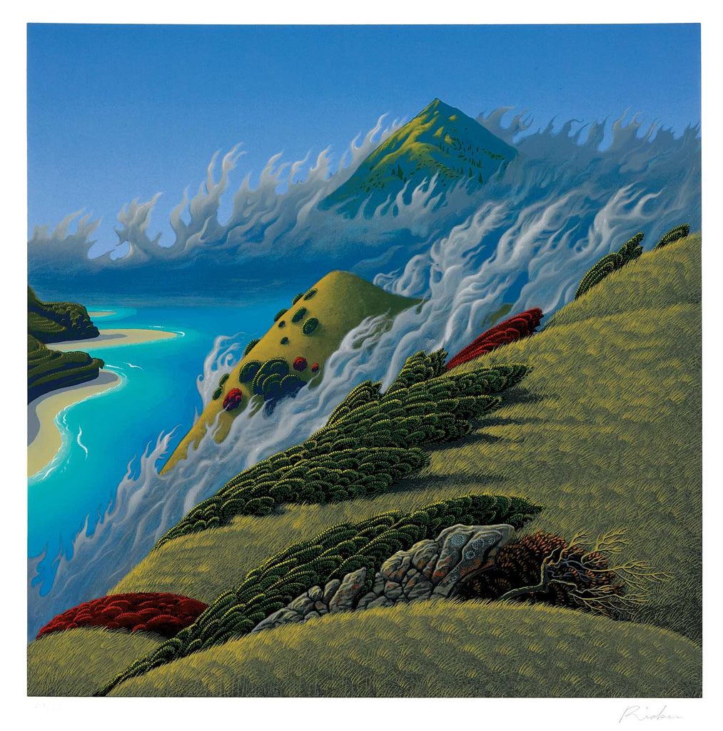 "Dragons" is a serigraph on linen created by Bruce Ricker. The image size is 13 x 13 -inch. The artwork ships framed, signed and with certificate of authenticity.