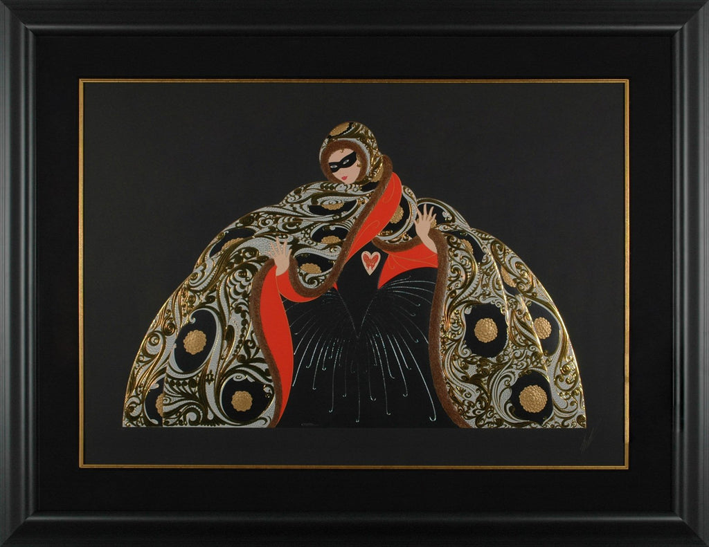 "Masquerade I" is an embossed serigraph with foil stamping on black paper created by Erté in 1987. From the edition of 337, the artwork is signed 'Erté' lower right. The image size is 28 x 40" and the artwork is framed in a contemporary black frame. The artwork ships framed and accompanied by a certificate of authenticity.