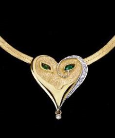 "Mysteries of the Heart: Emerald Eyes" is a necklace with gold, diamonds, and emeralds created by Erté. The necklace ships with a certificate of authenticity.
