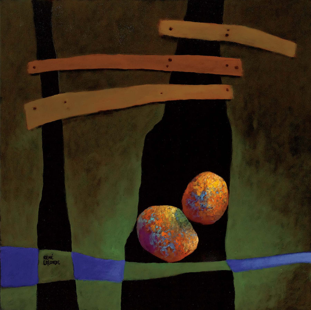 "There Must be Some Explanation" is an acrylic on canvas painting created by René Lalonde in 2012. The artwork is signed 'RENÉ LALONDE' lower left. The canvas size is 24 x 24" and the artwork is framed in a contemporary light wood frame. The artwork ships framed.