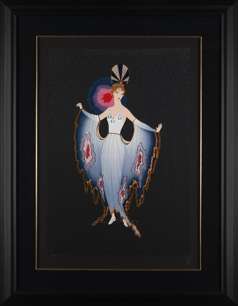 "Twilight" is an embossed serigraph with foil stamping created by Erté in 1987. From the edition of 601, the artwork is signed 'Erté' lower right. The image size is 29.75 x 20.5" and the artwork is framed in a contemporary black frame. The artwork ships framed and accompanied by a certificate of authenticity.