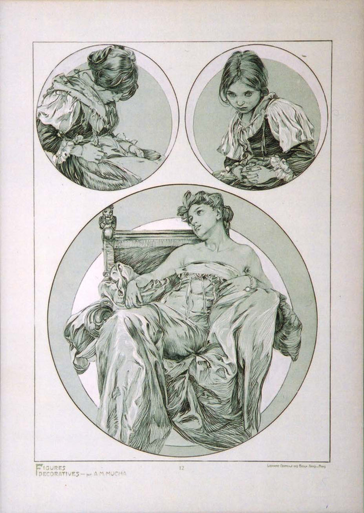 "Untitled (Figures Décoratives Plate #12)" is a lithograph created by Alphonse Mucha. The image size is 14.5 x 10.25 -inch. The artwork ships framed with a certificate of authenticity.