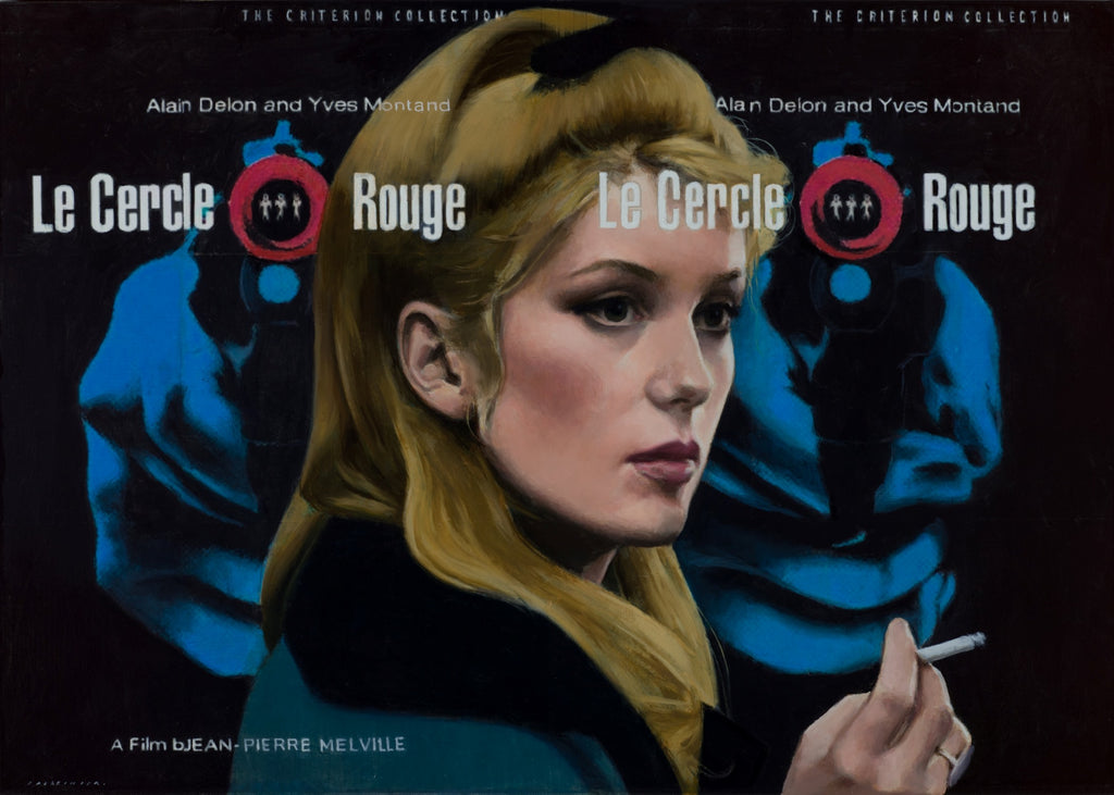"Catherine Deneuve at the Movies" is an oil and mixed media on canvas painting by François Fressinier featuring the iconic French actress Catherine Deneuve. The artwork is signed 'FRESSINIER' lower left. The canvas size is 29.5 x 41.5" and the artwork is framed in a contemporary black frame. The artwork ships framed.