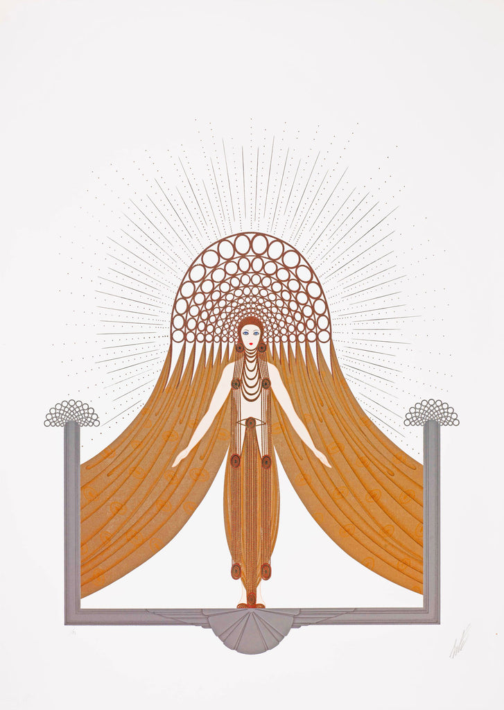 "Circe" is an expertly crafted serigraph on paper created by Erté for his "Myths" suite. "Circe" is based on the 1923 gouache "Le Gloire" currently held at the Metropolitan Museum of Art, NY and created as a costume design for "L'Or" at the Ziegfield Follies - 'Gold Costume Design with Olive Branch Headress and Armlets." Erté’s fanciful depiction of the great goddess Diana borrows the olive branches associated with Athena/Minerva and forms them into a stunning, radiating headdress, suggestive of the Moon which she rules.
