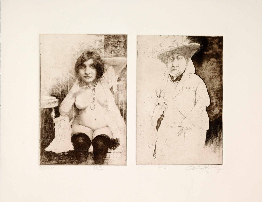 "1870 - 1910" is an etching created by Charles Bragg. The image size is 14 x 18 -inch. The artwork ships framed, signed and with a certificate of authenticity.