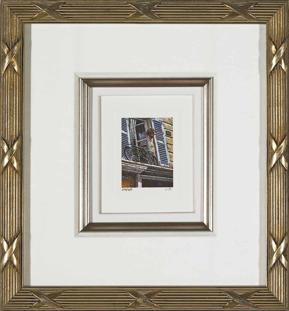 "188 Rue de Marcine" is a lithograph on paper created by Liudmila Kondakova in 2006. From the edition of 325, the artwork is initialed 'L.K' lower right and annotated lower left. The image size is 2.5 x 1.75" and the artwork is framed in a classic 'reed and ribbon' gold-tone frame. The artwork ships framed and accompanied by a certificate of authenticity.