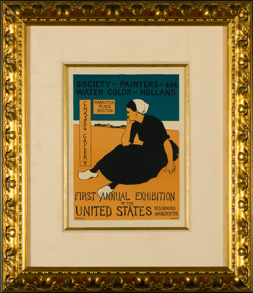 "1st Annual Exhibition in the U.S. (Plate 112)" is an original stone lithograph created by Charles H.Woodbury in 1898 for Les Maîtres de l'Affiche. The artwork is framed with the latest archival framing techniques, and it is accompanied by a certificate of authenticity.