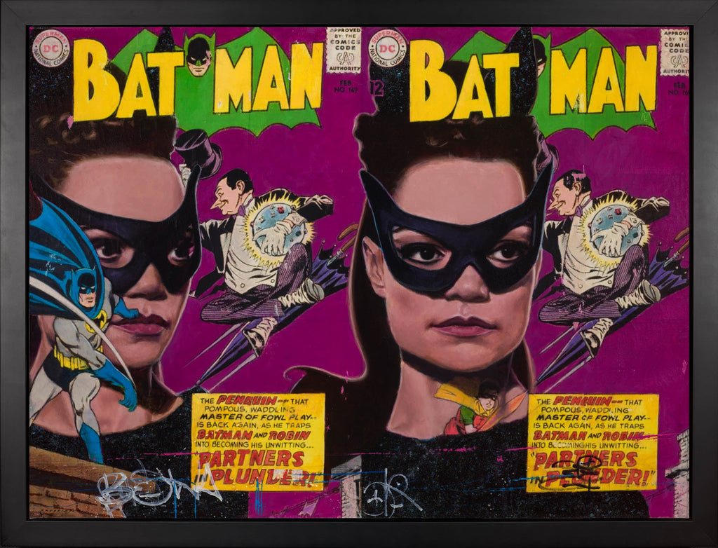"A Hero Can Be Anyone" is an oil and mixed media on canvas painting created by François Fressinier in 2024. The artwork is signed 'FRESSINIER' lower left. The canvas size is 33 x 44.5" and the artwork ships framed in a contemporary black frame. The artwork ships framed.