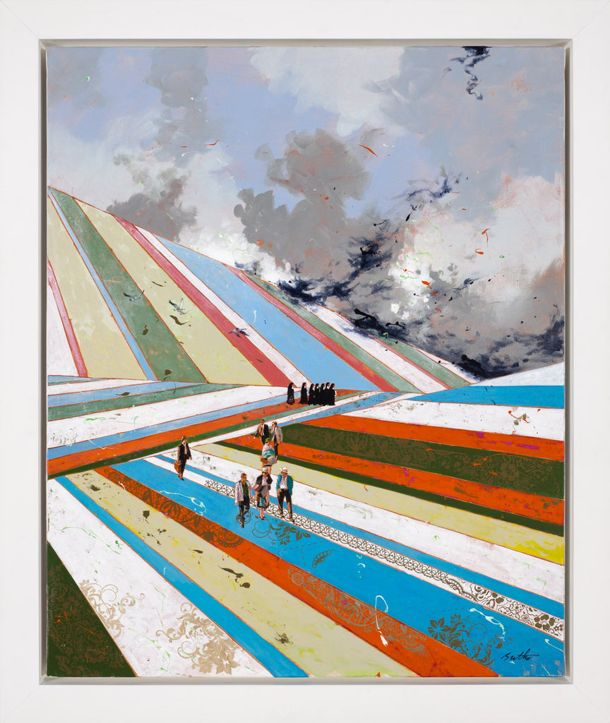 "Above the Ducks" is an acrylic on canvas painting created by Philippe Bertho in 2024. The painting is signed 'Bertho' lower right. The canvas size is 24 x 19.62" and the artwork is framed in a contemporary white frame. The artwork ships framed.