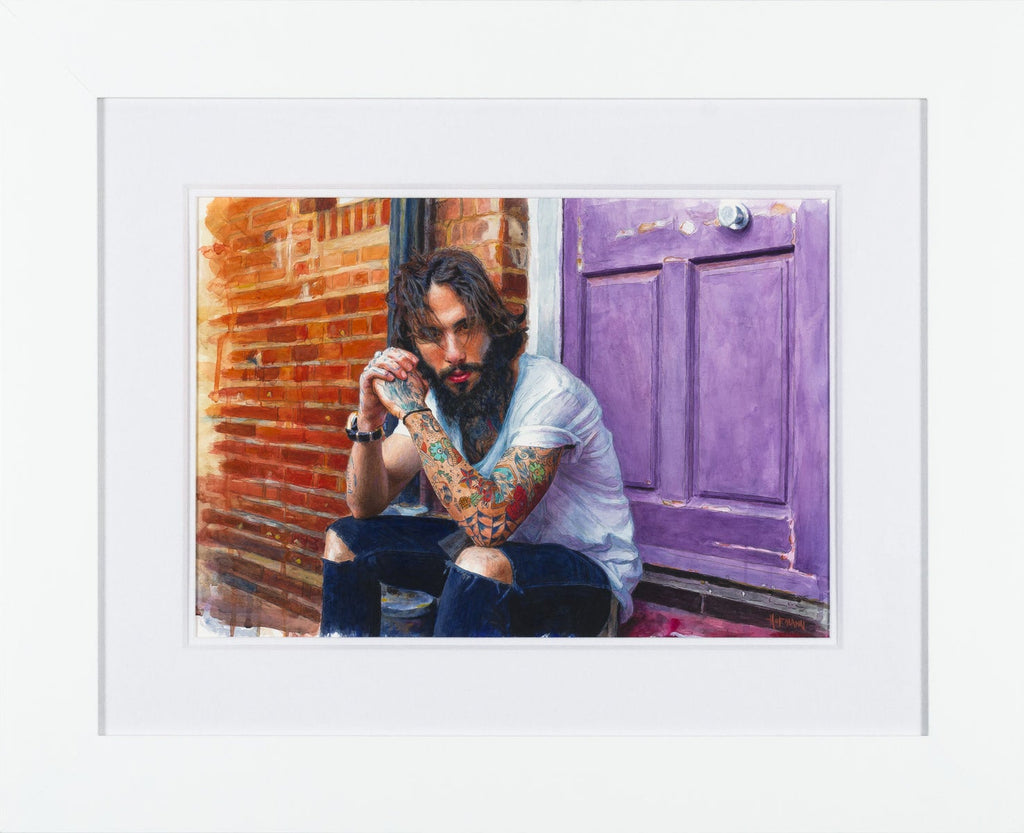 "Bad Boy" is a watercolor and pastel on paper painting created by Douglas Hofmann in 2020. The painting is signed 'HOFMANN' lower right. The image size is 15 x 21.25" and the artwork is framed in a contemporary white frame. The artwork ships framed.