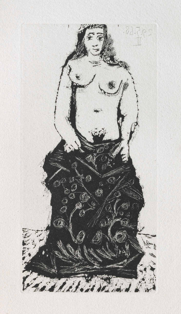 "Beautiful Girl in Long Robe (B.1605)" is an aquatint created by Pablo Picasso in 1968 for his series 'La Célestine'. From the edition of 400, the image size is 5 x 2". The artwork ships framed and accompanied by a certificate of authenticity.