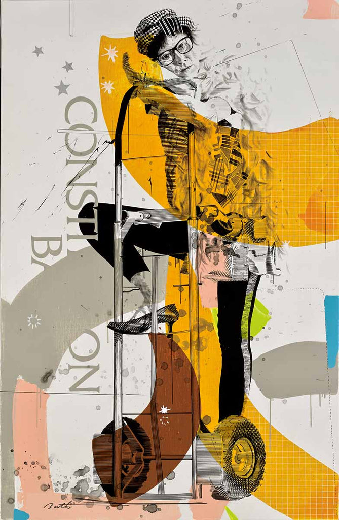 "Bernadette Soultz" is an acrylic on canvas painting created by Philippe Bertho in 2014. The painting is signed 'Bertho' lower left. The canvas size is 36.25 x 23.75" and the artwork is framed in a custom, closed-corner, gold leaf frame. The artwork ships framed.