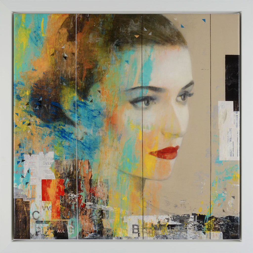 "Between the Lines" is a digital pigment print on canvas created by François Fressinier in 2018. From the edition of 325, the artwork is signed 'FRESSINIER' lower left and annotated lower right. The canvas size is 32 x 32" and the artwork is framed in a contemporary white frame. The artwork ships framed and accompanied by a certificate of authenticity.