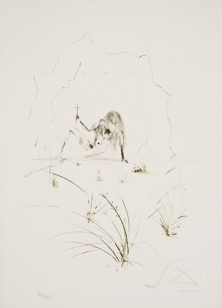 "Brother Ogrin, the Hermit (Plate K)" is an etching and drypoint created by Salvador Dalí in 1970 for his 'Tristan and Iseult' series. From the edition of 677, the artwork is signed 'Dali' lower right and annotated lower left. The image size is 15.75 x 10.87". The artwork ships framed and accompanied by a certificate of authenticity.