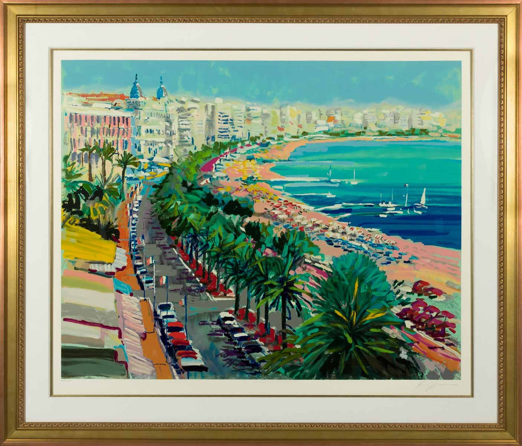 "Cannes" is a serigraph on paper created by Kerry Hallam in 1992. From the edition of 500, the artwork is signed 'Kerry Hallam' lower right and annotated lower left. The image size is 36 x 45" and the artwork is framed in a classic, gold-tone frame. The artwork ships framed and accompanied by a certificate of authenticity.