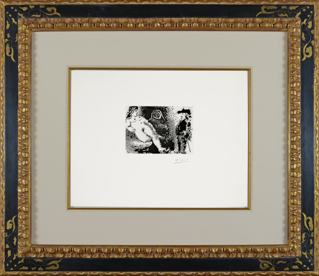 In printmaking, the 347 Series was the undertaking which defined late Picasso. This prodigious outpouring of work, dating from March 16th–October 5th, 1968, deals with all of his old themes and fantasies, adding an obsession newly central in the late sixties, the artist as voyeur. It is in this role, rather than that of a protagonist, that the artist figures in these fantastic narration's. The series has been described as taking the form of a stream-of-consciousness epic. There is a suggestion of narratives throughout the series; however, there is never a point where a story comes to completion or where suggested desire is realized. There are faces we know, tales we have seen, and the work of great masters is recognizably revisited, but all without a clear endpoint. These prints become instead a stroll through the mind and memories at the end of Picasso’s much-lived life. A note about the technical production of these plates - to work with full freedom and concentration, Picasso had his printers, the brothers Crommelynck, bring the etching plates and hand press to his farmhouse near Cannes.