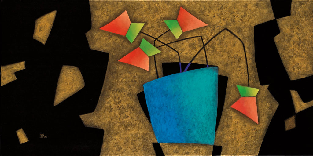 "Charmed by the Unusual" is an acrylic on canvas painting created by René Lalonde in 2014. The artwork is signed 'RENÉ LALONDE' lower left. The canvas size is 24 x 48" and the artwork is framed in a contemporary black frame. The artwork ships framed.