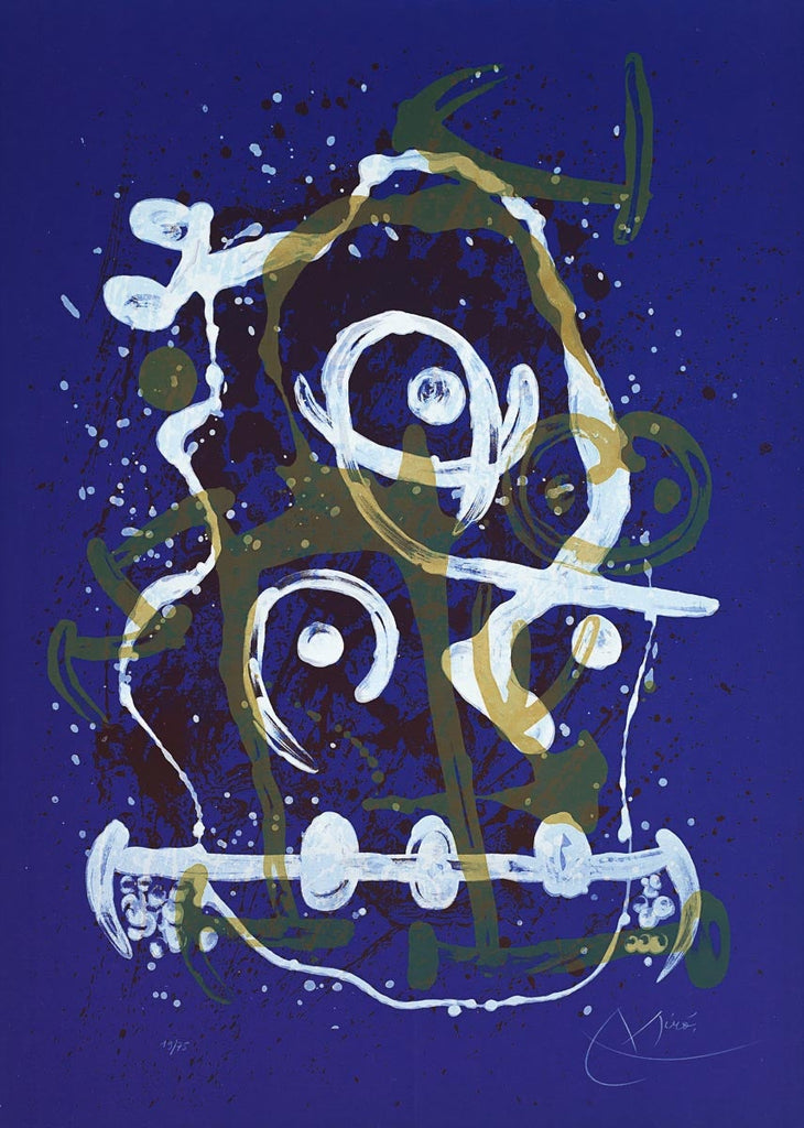 Joan Miró is regarded as one of the most original artists of the 20th century, who often worked with a limited palette, yet the colors he used were bold and expressive. His mature style evolved from the tension between his fanciful, poetic impulse and his vision of the harshness of modern life. Miró worked extensively in lithography and produced many murals, tapestries, and sculptures for public spaces. Despite his fame, he continued to devote himself exclusively to looking and creating. Joan Miró was born in Barcelona, Spain on April 20, 1893. His father was an artisan watchmaker and goldsmith. Based on his parents’ wishes, Miró attended a commercial college, then found work as a clerk in an office for a short period of time. Unfulfilled by his profession, Miró asked for his parent’s permission to allow him to attend art school in Barcelona in 1912. There, he gained great experience learning under Francisco Galí.
